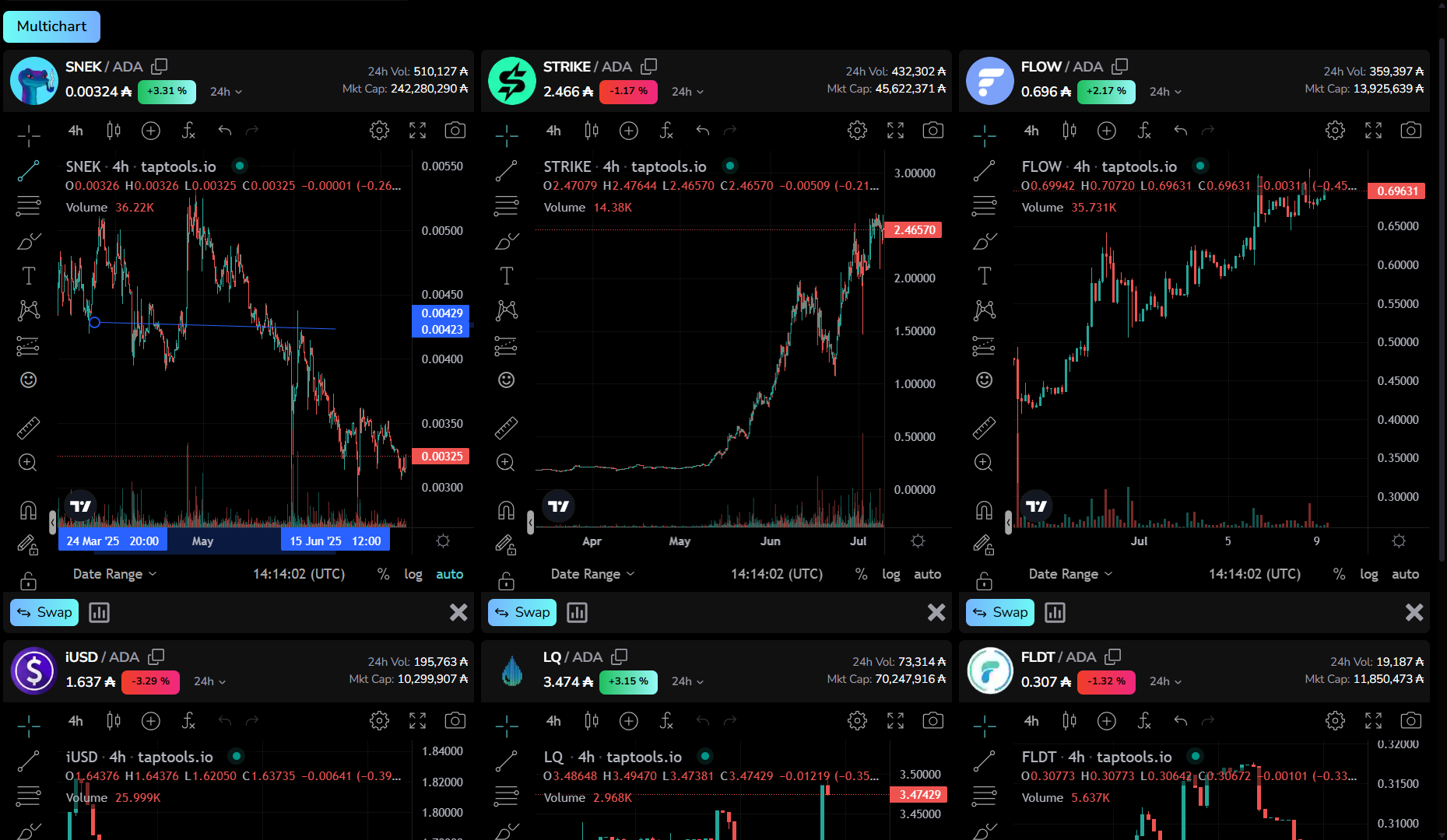 The Multichart tool displays up to six token charts on the same page, making it easy to keep track of multiple assets at a glance. &#x20;